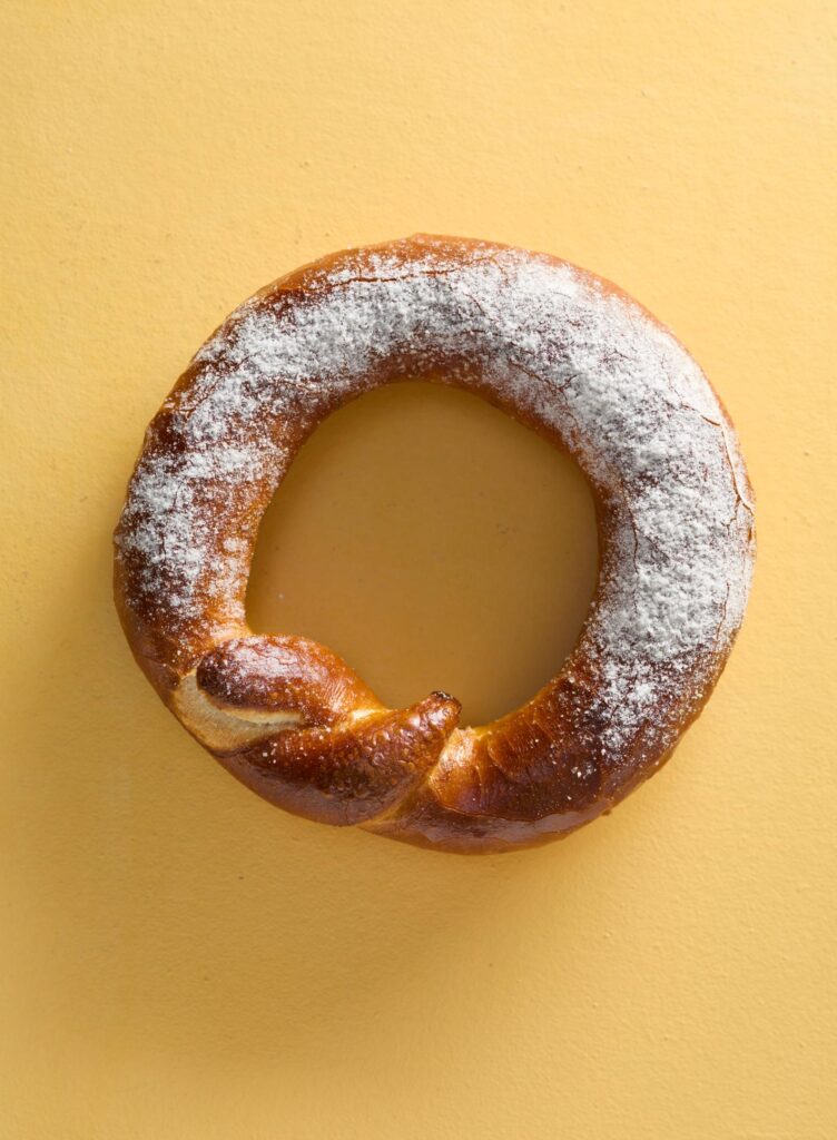 Der für die obige Teiglingsmenge ca. 40 cm lange Strang wird zu einem Ring geformt, dessen Enden sich ganz dezent „umarmen“. Sie reißt kaum auf, wird auch nicht geschnitten, geht deshalb mit voller Gare (also reifer als die anderen Brezel-Arten) in den Ofen.