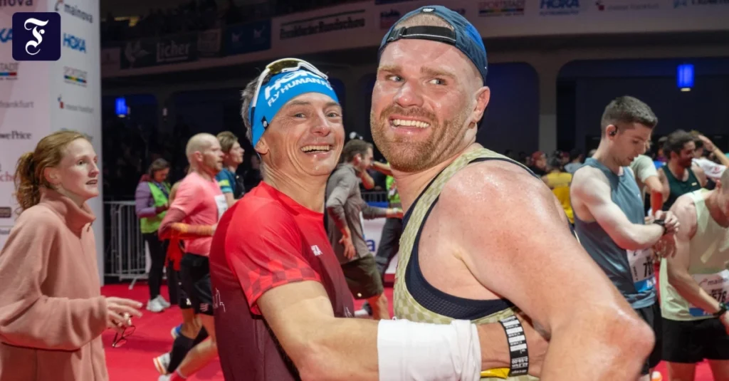 Lang Vietzke läuft wie ein Uhrwerk, wie das Live-Tracking des Veranstalters beweist. Fünf Kilometer bewältigt er konstant in knapp über 28 Minuten, auf der Schweizer Straße prüft er entspannt mit einem Schulterblick, wie die Schar von gut 40 Läufern folgt. „Das ist ein gutes Gefühl“, sagt er. Nach 3:58:39 kommt der bei Siemens tätige Jurist ins Ziel, das in Frankfurt „einzigartig sei wegen des Einlaufs in der Festhalle“ unter stroboskopartigem Scheinwerferlicht. In seinem Gefolge befindet sich ein Oberbürgermeister. „Er hat mich bei Kilometer 39 überholt, da wusste ich, dass ich noch ein bisschen was tun muss“, sagt Thomas Nitzsche, Stadtoberhaupt von Jena. „Torsten hat mich ins Ziel getragen.“