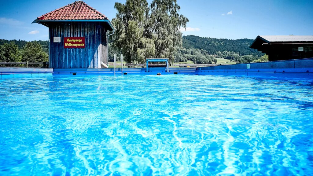 Das kleine Glück liegt an diesem Junitag in einer Senke zwischen Bramersberg, Holzapflern und Einweging. Angenehme 27 Grad, ein leichter Wind weht über die Hügel des Bayerischen Walds, in sattem Türkis schimmert ein Pool so verheißungsvoll, dass man am liebsten sofort eintauchen möchte. Jetzt ein paar Bahnen schwimmen, sich federleicht fühlen, den Alltag abperlen lassen.
