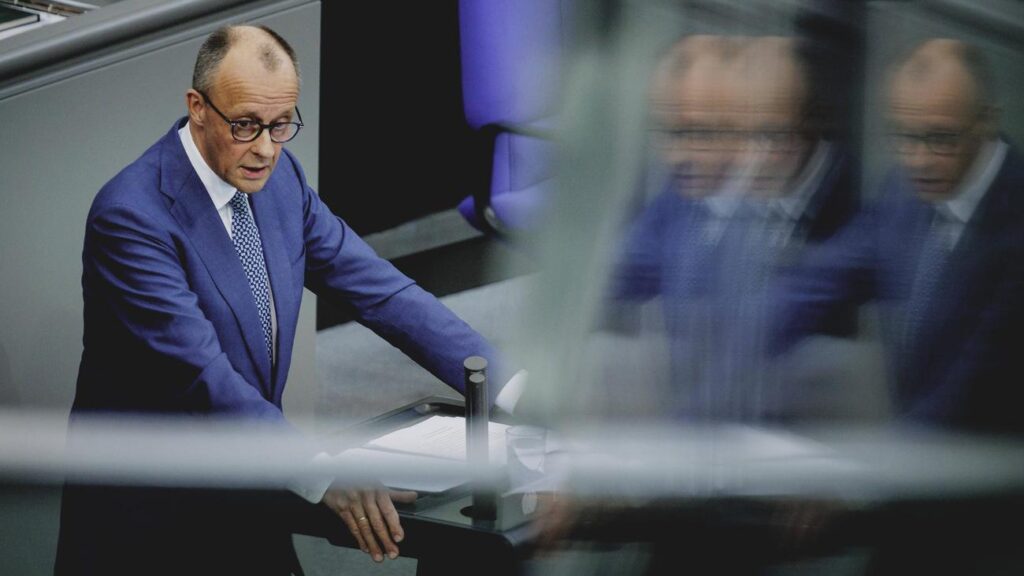Friedrich Merz spricht schon eine Weile über den bevorstehenden EU-Gipfel, über seine Initiativen zum Bürokratieabbau, zur Unterstützung der Ukraine, und recht allgemein über die neue Welt der Großmächte, dann erst kommt er zu dem, worauf viele Zuhörer wohl warten: Die Konfrontation über den Irankrieg mit den USA, seine harte Absage an Donald Trump, der Hilfe nicht erbeten, sondern verlangt hat in der Straße von Hormus.
