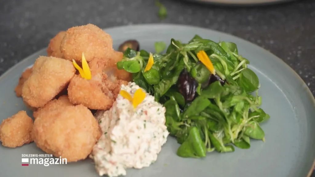 Frittierter Blumenkohl auf einem Teller angerichtet mit Trauben-Feldsalat.  | Screenshot