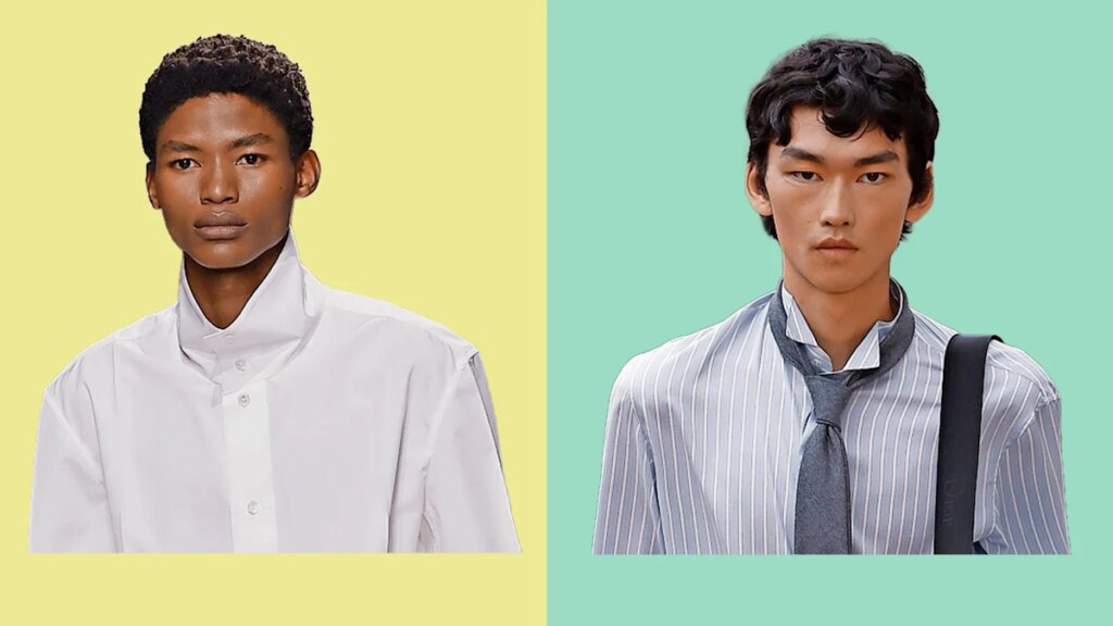 Wenn nun mehrere große Luxusmarken, hier im Bild der Dior-Laufsteg, Jünglinge in unordentlichen oder halb aufgeschlagenen Hemdkragen und verdrehten Krawatten ablichten, hat das eine etwas andere Botschaft: Das Unordentliche im Ordentlichen ist sexy. Männer sehen damit ein bisschen aus wie frisch geprügelt oder als kämen sie von einem stürmischen Date. Vielleicht sind sie aber auch nur liebenswerte Chaoten aus gutem Elternhaus, die in die Welt stürmen, ohne noch mal in den Spiegel zu schauen? Welche Variante auch immer der Betrachter erkennt – sie alle unterstreichen einen menschlichen Aspekt, der gerade der formalen Herrenmode gelegentlich abgeht. Es wird aber im Zeitalter von KI und Robotik, ein wichtiger Soft Skill werden, ein bisschen liebenswert derangiert auszusehen, weil einen das von der Perfektion der Maschinen abhebt. Das bedeutet keinen Freifahrtschein für gemütliche Verwahrlosung, sondern gezielte Pointen – von Menschen für Menschen.