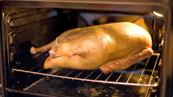 Während des Garens die Gans unterhalb der Keulen mehrfach anstechen, damit das Fett austritt. Immer wieder mit dem austretenden Bratensaft begießen, damit das Fleisch nicht austrocknet und die Haut schön knusprig wird. Wichtig: Das Fleisch vollständig durchgaren, es sollte eine Kerntemperatur von mindestens 80 Grad erreichen. Um das zu kontrollieren, hilft ein Braten-Thermometer. Der Gänsebraten ist fertig, wenn beim Einstechen der Keulen klarer Saft austritt und sich das Fleisch leicht vom Beinknochen ablöst.
