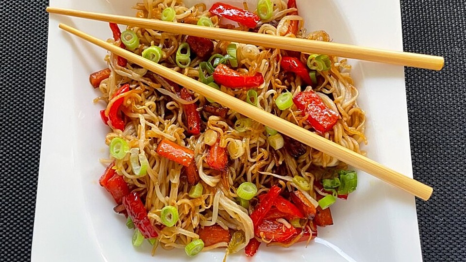 Karotten schälen und stifteln. Paprikaschoten in schmale Streifen schneiden. Zwiebeln in Streifen oder Lauch in Ringe schneiden. Sojasprossen abtropfen lassen. Weißkohl in Streifen schneiden. Knoblauchzehen hacken.
