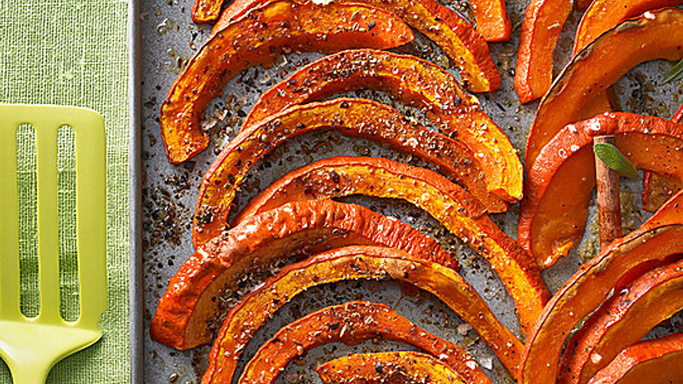 Kürbis gründlich waschen, auseinander schneiden und die Kerne aus dem Kürbis schaben. Dann in Spalten schneiden, auf ein mit Olivenöl befettetes Backblech legen und mit Meersalz bestreuen.
