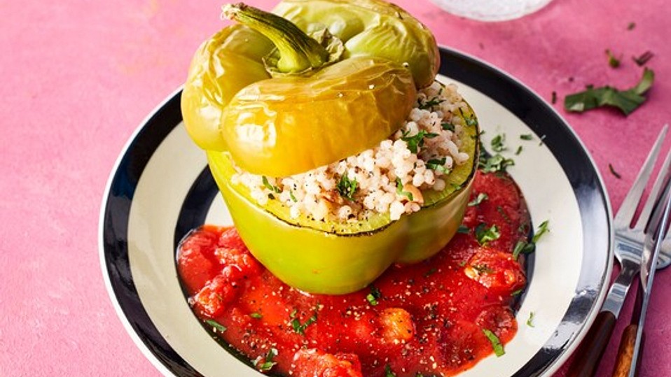 Von den Paprika einen Deckel (am Stiel) abschneiden und Kerne und helle Zwischenwände entfernen. Mit der Hirsemasse füllen und jeweils einen TL Olivenöl darüber geben.