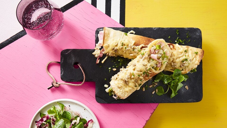 Die Zwiebel würfeln, den Lauch in feine Scheiben schneiden. Die Zwiebel zusammen mit dem Lauch ca. 10 Min im Öl anschwitzen. Den Schinken in Würfel oder kleine Streifen schneiden und dazugeben. Die Crème fraîche unterrühren und mit Salz, Pfeffer und der gekörnten Brühe würzen.