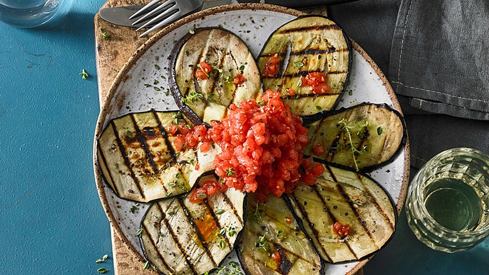 Die Auberginenscheiben auf einen vorgewärmten Teller legen und die Tomatensalsa darauf in der Mitte anrichten. Noch etwas frisches Olivenöl darüber träufeln und servieren. Mit oder ohne Baguette genießen (bei low carb / SiS darauf verzichten).