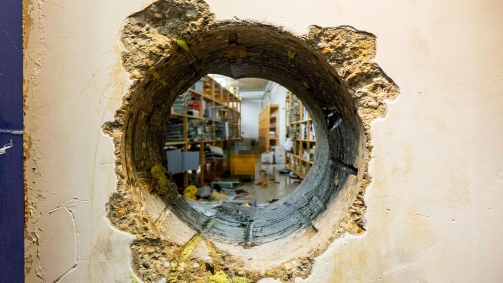 Loch in eine Wand gebohrt, um in den Tresorraum zu gelangen. Fast alle