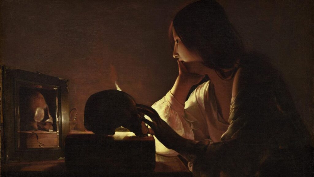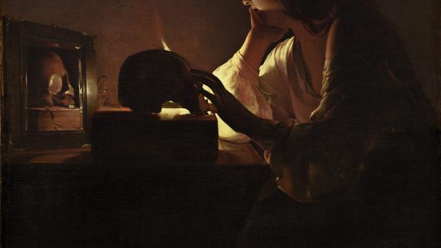 Manches, was er, der große französische Barockmaler, vor gut 400 Jahren auf die Leinwand brachte, erinnert an die Stille und Einfachheit, wie sie sehr viel später von Avantgardisten wie Kasimir Malewitsch ins Bild gesetzt wurden. La Tour rückt seine Motive in eine Zone des Übergangs, gleichsam zwischen Sein und Nichtsein. Auch seine Maria Magdalena, eine Frau im Dunkeln, hat er dahin entführt, sie tut nichts, sagt nichts, sie träumt nur versonnen vor sich hin. Ihr Haar ist offen, die Schulter entblößt. Erschöpft sitzt sie an ihrem Tisch, die eine Hand hält das Kinn, die andere streichelt sacht über einen Totenschädel. Und wie so oft bei La Tour erhellt nur eine einzige Kerze das Bild. Oder genauer die obere Hälfte der Szene; der Rest bleibt unbeleuchtet und unsichtbar.