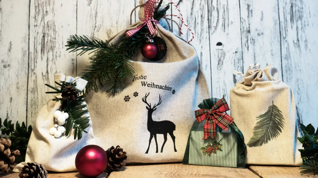 Wer wenig Zeit hat oder nicht so gern bastelt, verwendet schlichtes Papier, Tüten, Stoffbeutel oder ein Stück Stoff und dekoriert sie nach Geschmack mit bunten Bändern, Fundstücken aus der Natur wie Zapfen, Beerenzweigen oder Efeuranken.