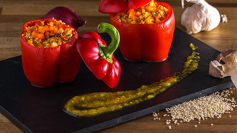 Anschließend die Pilze mit der Quinoa vermengen und den geriebenen Parmesan dazugeben. Die Paprikaschoten mit der Quinoamasse füllen und in eine passende Form geben. Die Form mit der restlichen Gemüsebrühe auffüllen und in den Airfryer stellen.