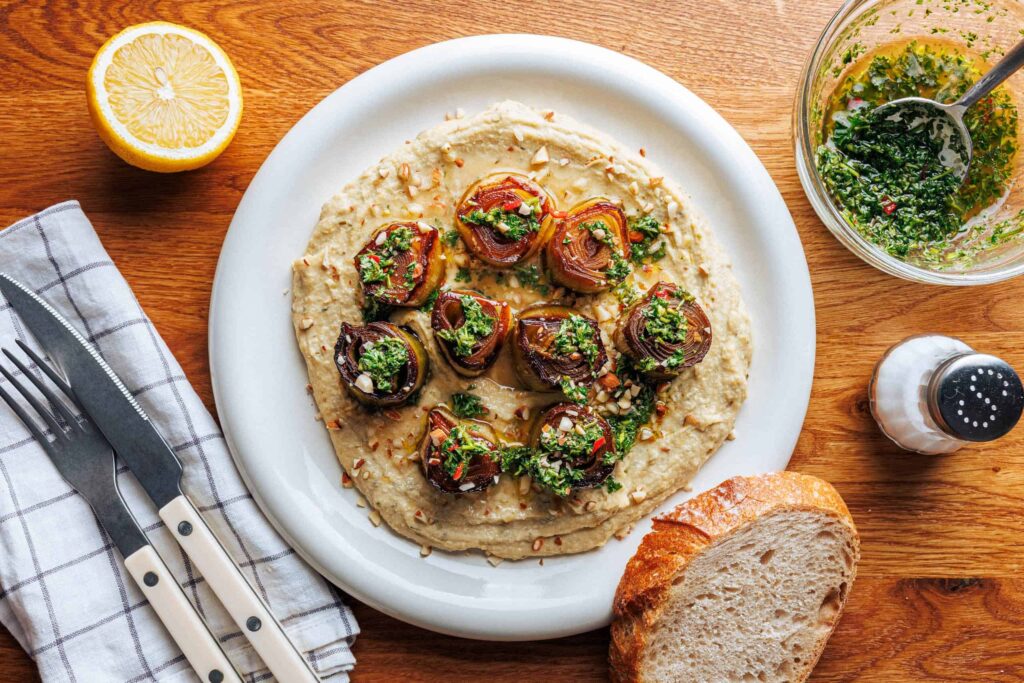 In 30 Minuten ein fancy Dinner auf den Tisch zaubern? Funktioniert. Und zwar ganz entspannt – mit diesem süß-sauer geschmorten Lauch auf cremigem Hummus, getoppt mit gerösteten Mandeln.