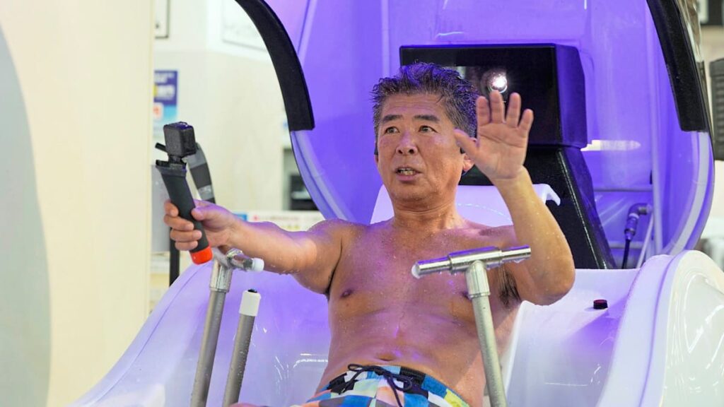 Die Maschine sieht ein wenig aus das Cockpit eines Kampfjets, ist aber eigentlich eine Mischung aus geschlossener Badewanne und Mini-Dusche, die sich teilweise mit warmem Wasser füllt. Die Waschmaschine für Menschen kann aber noch mehr als ihren Insassen sauber und rein machen.
