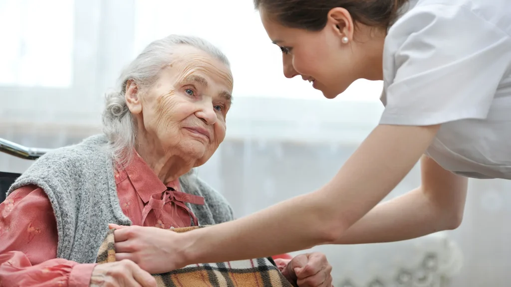 Eine junge Pflegerin kümmert sich um eine alte Frau. | phantermedia, alexraths
