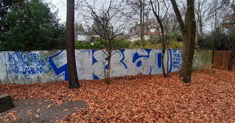 Was ebenso auffällt, am Mauerrand und Efeublättern ist rote Farbe zu erkennen. Es ist also gut möglich, dass an dieser Stelle einst ein Graffiti von FC-Bayern-Fans zu sehen war und nun von Löwen-Anhängern übersprüht wurde.