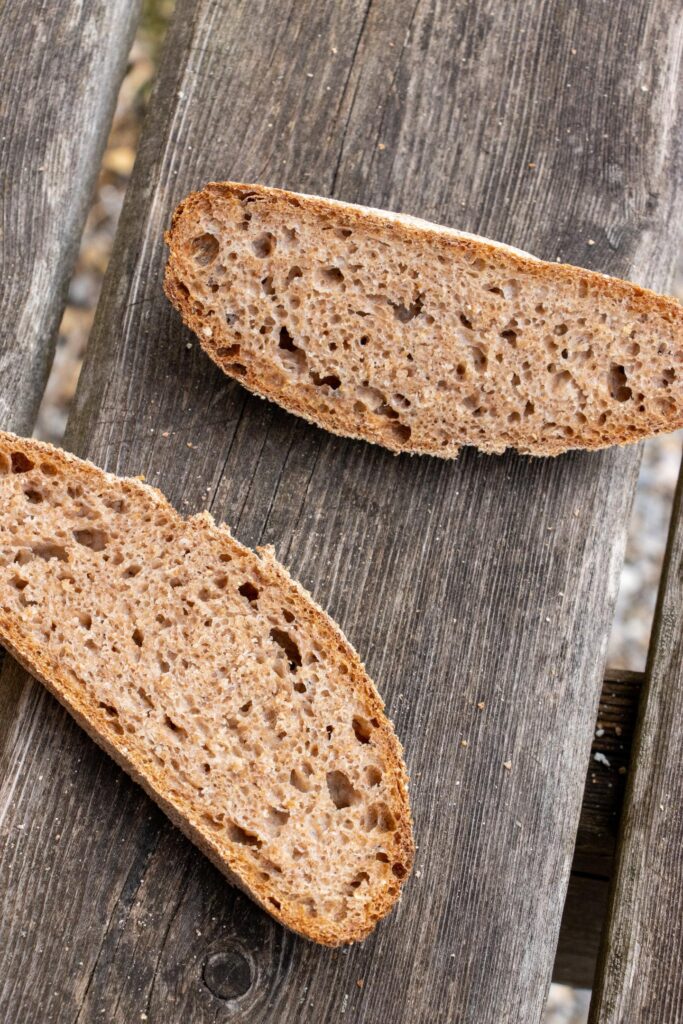 Der Teig hat mehr Wasser bekommen und wurde öfter gedehnt und gefaltet. Das Brot ist saftiger, bleibt länger frisch, hat aber einen flacheren Scheibenquerschnitt.