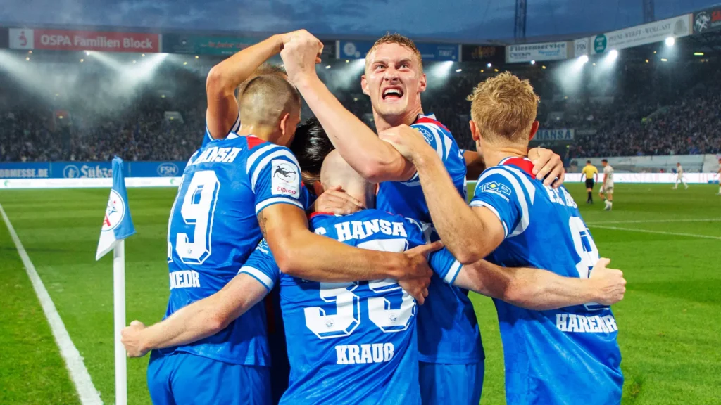 Der FC Hansa Rostock hat nach seinem holprigen Start in die neue Saison der 3. Liga mit einer Gala-Vorstellung ein Ausrufezeichen gesetzt. Das Team von Trainer Daniel Brinkmann bezwang am Mittwochabend den TSV 1860 München mit 2:1 (2:0) und spielte dabei im ersten Abschnitt wie im Rausch.