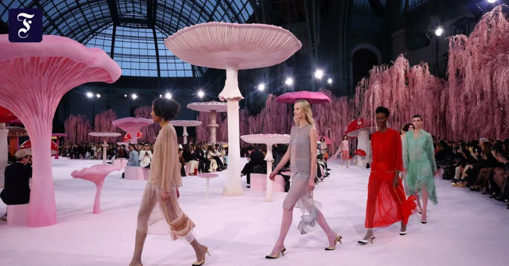 Auch die Kundinnen bei Chanel können sich auf Neues freuen. Die Gäste treten aus dem strömenden Regen in einen psychedelischen Märchenwald: Rosa Pilze, manche fast so groß wie Häuser, wachsen aus dem flauschigen Teppich. Für Blazys Couture-Debüt hat man keinen Aufwand gescheut. Die leichte und tragbare Kollektion markiert ein neues Kapitel in der Geschichte des Hauses. Gabrielle „Coco“ Chanel befreite einst die Frauen von Korsett und aufgebauschten Röcken. Blazy treibt das auf die Spitze und macht das klassische Kostüm zur zweiten Haut: Es ist aus nahezu durchsichtigem Organza gefertigt, dessen Saum mit Perlen verziert ist. Wie bei Coco Chanel reichen die geraden Röcke bis zur Wade. Das Brautkleid ist ein locker geschnittenes Kostüm in Perlmutt, als Variation der für Chanel typischen Perlen. Blazy zeigt Farbe in Form roter Tweeds und zartgrüner Kleider.