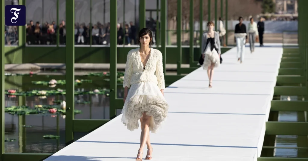 Die Zuschauerplätze rund um das Bassin Octogonal hat er vorsichtshalber mit einem Glasgerüst überdachen lassen. Aber am Himmel ist keine einzige Wolke zu sehen, kein einziger Regentropfen fällt auf die künstlichen Seerosen, die in aller Ruhe auf grünen Blättern im Wasser schweben, während die Models über einen quergelegten Laufsteg defilieren.