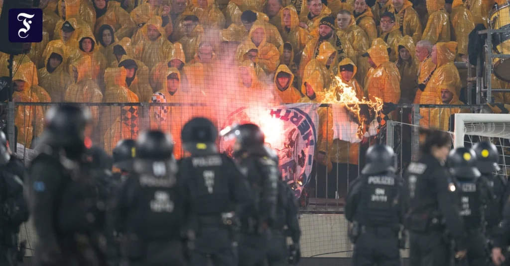 Schiedsrichter Sven Jablonski musste die Zweitliga-Begegnung unterbrechen und schickte die Teams nach den Krawallen in die Kabine. Unterdessen versuchten Polizisten, die Dynamo-Anhänger zurück in ihren Block zu drängen. Dort wurde dann eine Hertha-Fahne abgebrannt.