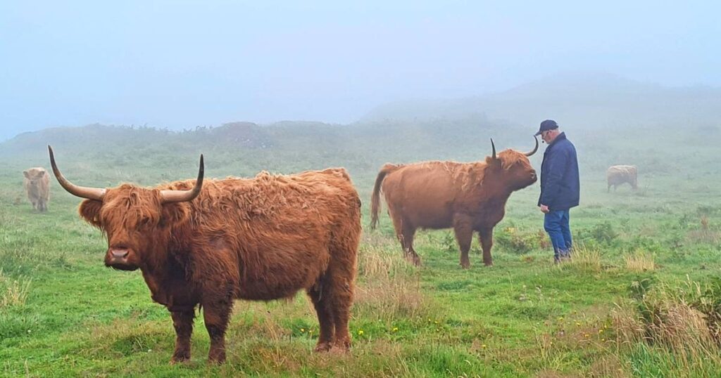 Statt in die Highlands führt das Navi in den äußersten Südwesten Schottlands, in das landwirtschaftlich geprägte und spärlich besiedelte Dumfries & Galloway. Eine Region, die Touristen weit seltener ansteuern als die Isle of Sky oder die Küstenroute North Coast 500. Dabei locken Wanderungen durch die waldreiche Hügellandschaft des Galloway Forest Park, entlang zerklüfteter Küsten und menschenleerer Strände – und ein besonderes Erlebnis auf der Airyolland Farm.