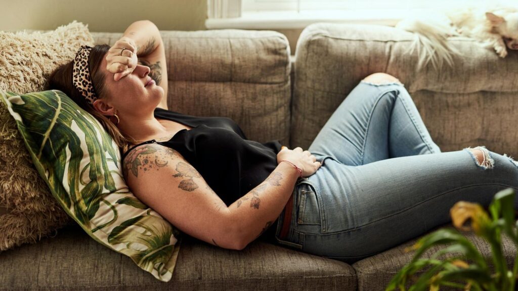 Hormonstörung PCOS: Frau liegt mit Bauchschmerzen auf dem Sofa
