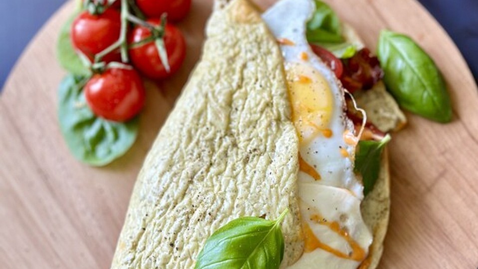 Für 30-35 Minuten bei 180 Grad Umluft backen. Abkühlen lassen und dann den Wrap vorsichtig vom Backpapier abziehen. Jetzt könnt ihr euren Wrap mit allem belegen, was euch schmeckt.