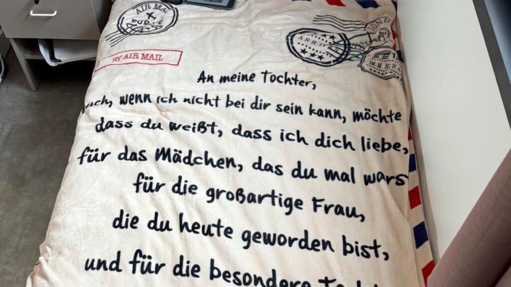 Die Aufschrift auf der Decke ist eine Liebeserklärung an ihre Tochter Hannah: „An meine Tochter, auch wenn ich nicht bei dir sein kann, möchte ich, dass du weißt, dass ich dich liebe, für das Mädchen, dass du mal warst, für die großartige Frau, die du heute geworden bist und für die besondere Tochter, die du immer sein wirst. Decke dich hiermit zu und nimm es als große Umarmung. In Liebe, deine Mama.“