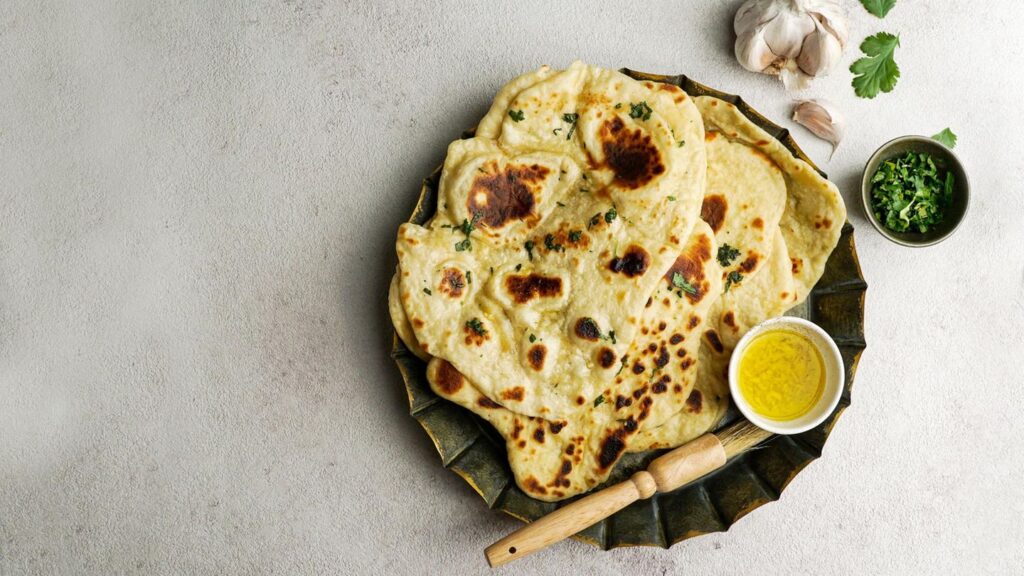 Das traditionell im Lehmofen gebackene Naan besticht durch seinen fluffigen Teig, bestehend aus Hefe, Mehl, Öl, Wasser und Salz und typischerweise etwas Joghurt.