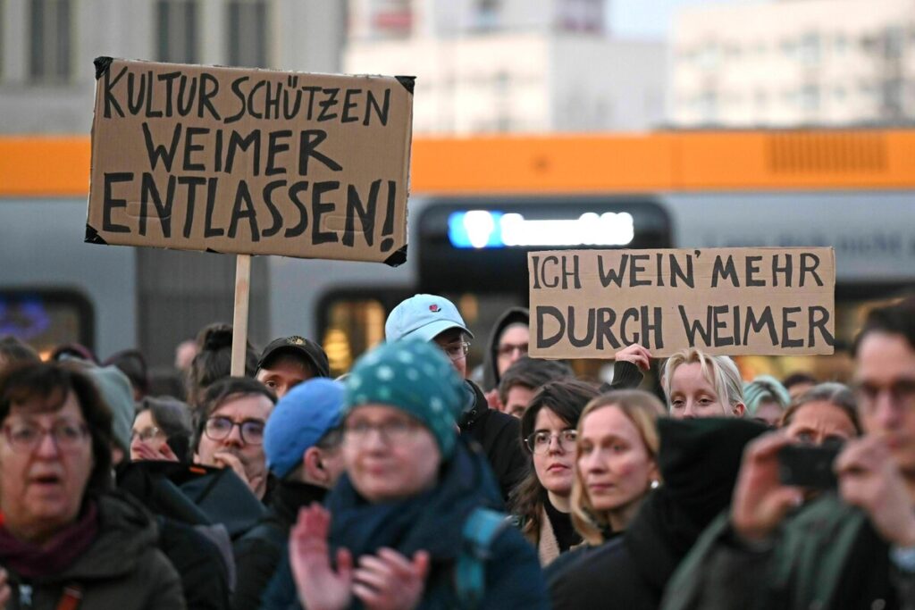 Weiße Schrift auf rotem Hintergrund: „Willkommen in der Weimerer Republik“ steht auf einem Plakat an der Stellwand eines Indie-Verlags auf dem Leipziger Messegelände. Dazu ein Foto des grinsenden Kulturstaatsministers, dem das Lachen nach seiner von Buhrufen begleiteten Eröffnungsrede auf der Leipziger Buchmesse am Mittwochabend wohl im Hals stecken blieb.