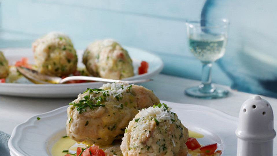 Die Zwiebel und den Knoblauch fein hacken und in einer Pfanne mit 1 EL Butter glasig anschwitzen. Zu den eingeweichten Brotwürfeln geben. Mit Salz und Pfeffer würzen und mit Mehl und Semmelbröseln binden. Den Bergkäse in kleine Würfel schneiden und unter die Masse mischen. Den Teig im Kühlschrank ca. 1 Stunde ruhen lassen und nochmals leicht durchkneten.