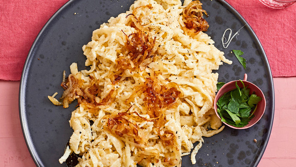 Die Zwiebeln schälen und in Ringe schneiden und dunkelbraun braten. Anschließend auf den Käsespätzle verteilen.