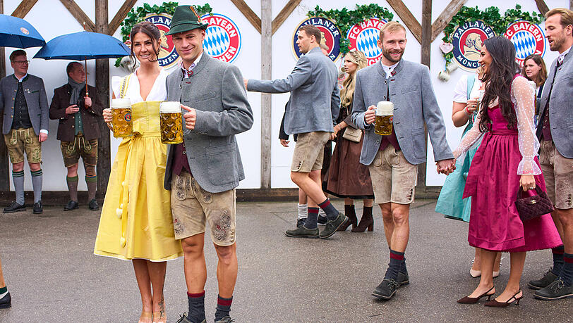 Die kleinen Trachtenanstecker waren im Hause Kimmich diesmal besonders beliebt. Beim sonntäglichen Ausflug des FC Bayern auf die Wiesn präsentierte Mittelfeldstar Joshua einen „I love Bier“-Button, während Gattin Lina sich als „Wiesn-Ultra“ zeigte. Zweifellos: Das Paar hat über die Jahre immer mehr Gefallen am Oktoberfest gefunden, es war heuer nicht der einzige Besuch der beiden.