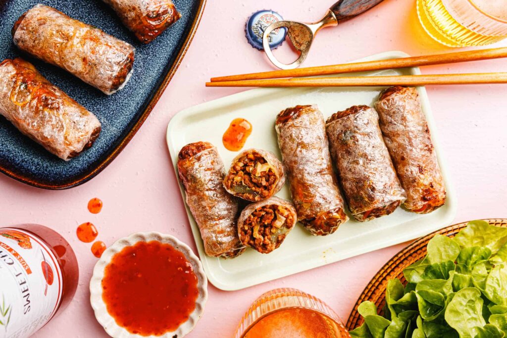 Am besten frisch und heiß servieren – wir haben uns ein Klecks der guten alten Sweet-Chili-Sauce gegönnt, unsere frische, feurige Chili-Essig-Sauce macht die Röllchen aber fast noch ein bisschen unwiderstehlicher.
