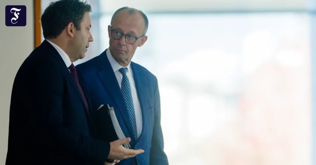 Bundesfinanzminister Lars Klingbeil und Bundeskanzler Friedrich Merz nach einem Stahlgipfel Anfang des Monats im Bundeskanzleramt