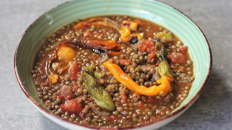 Der abgekühlten Paprika mit einem spitzen Messer die Haut abziehen und den Saft auffangen. Paprika halbieren, Kerne rausholen und in Streifen schneiden. Linsen in die Sauce geben, weitere 5 Minuten köcheln und vom Herd nehmen. Paprikasaft einrühren, salzen und in einer Schüssel anrichten, mit den Paprika garnieren.
