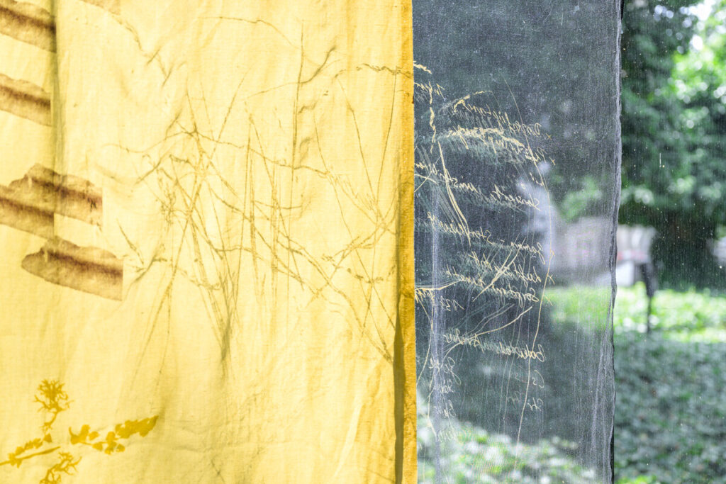Archaisch wirkende Stoffbahnen hängen von der Decke. Sie sind bedruckt mit Fotografien getrockneter Pflanzen und eingefärbt mit Pigmenten gemörserter Pflanzenfasern. Sie werfen mächtige Schatten und verschwistern sich mit dem Strauchwerk draußen. Sie sind Medium, Bild, Textil und Installation in einem.