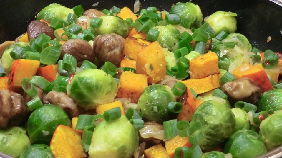 • Kürbis-Rosenkohl-Maronen-Pfanne