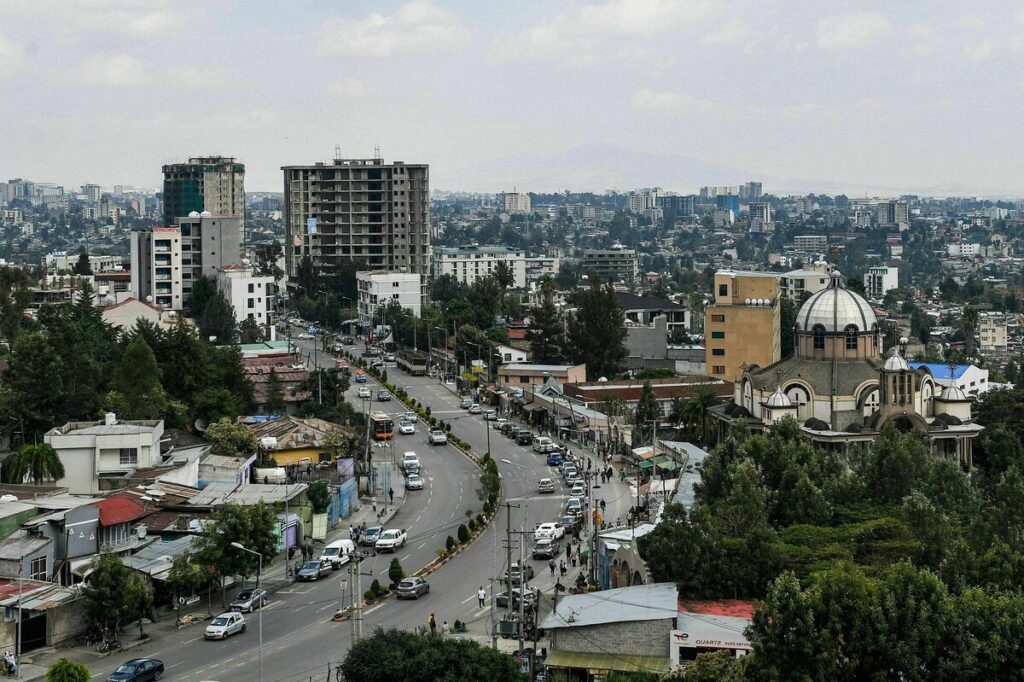 Wer zum ersten Mal in der ostafrikanischen Metropole landet, bemerkt schon auf der kurzen Strecke vom neuen Flughafen in die Innenstadt die mehrspurige Prachtstraße, gesäumt von breiten Bürgersteigen und sauberen Fassaden. Sogar Fahrradwege gibt es, auch wenn ich in sechs Tagen kein einziges Fahrrad sehe – außer dem der Goethe-Institutsleiterin Angelika Eder. Doldenartige Straßenlaternen „Dubai-Style“ beleuchten nicht nur die nagelneue Airport-Road, sondern finden sich auf allen innerstädtischen Boulevards. Im Regierungsviertel dominieren seit ein paar Jahren aufwendig bewässerte und bewachte Parkanlagen wie der Unity- und der Friendship-Park. Hier, aber auch in den Stadtteilen Kazanchis und Piassa wurden bereits Zehntausende, von Binnenflüchtlingen bis zur Mittelschicht, in Hochhäuser an der Peripherie umgesiedelt – mit einschneidenden Folgen für deren gewachsene Nachbarschaften und Mikroökonomien.