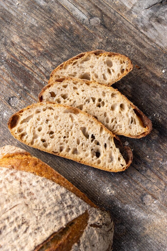 Wir haben uns an die Arbeit gemacht und ein Brot dieser Art entwickelt. Das Rezept arbeitet mit zwei Sauerteigen und einem recht weichen Teig.