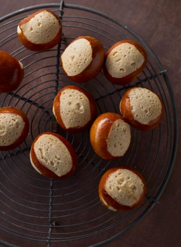 Sie sehen auf den ersten Blick täuschend echt aus. Das Geheimnis ist schnell gelüftet: Eine gelaugte Teigstange wird in Scheiben geschnitten. Die Schnittflächen sind nicht mit Lauge in Kontakt gekommen und bleiben deshalb fast weiß.