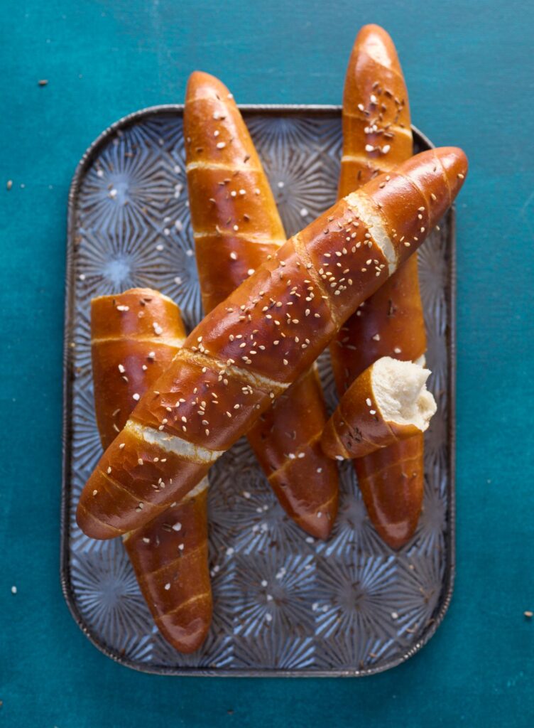 Streue für den besonderen Kick nach dem Laugen nicht nur etwas Salz, sondern zusätzlich noch Kümmel auf die Oberfläche. Du kannst vor dem Aufwickeln auch fein geriebenen Käse, eine Scheibe Kochschinken oder andere dünne oder feinstückige Zutaten auf den ovalen Teigling legen und mit einwickeln. Lass deiner Kreativität freien Lauf!
