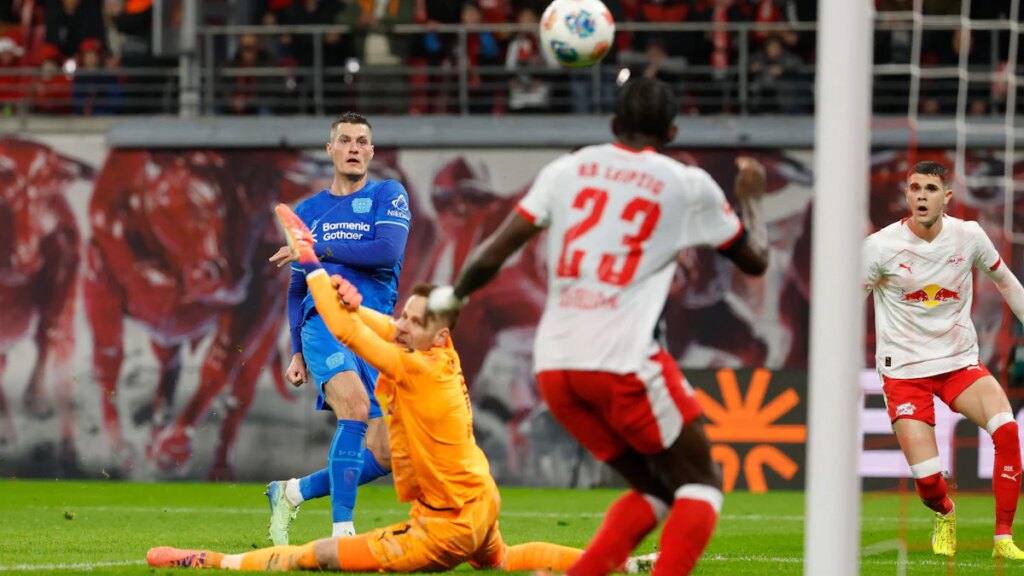 Doch Leverkusen reagierte. Erst durch Terrier, der eine wohltemperierte Flanke von Arthur per Kopf und im hohen Bogen in den Winkel verlängerte (40.). Und dann durch Schick. Nathan Tella schickte den tschechischen Stürmer, der einst auch in Leipzig gespielt hatte, in den von RB-Kapitän Willi Orbán sträflich vernachlässigten Raum. Dort tanzte Schick den Außenverteidiger Kosta Nedeljkovic aus, ehe er den Ball zum 2:1-Pausenstand unter die Querlatte jagte.