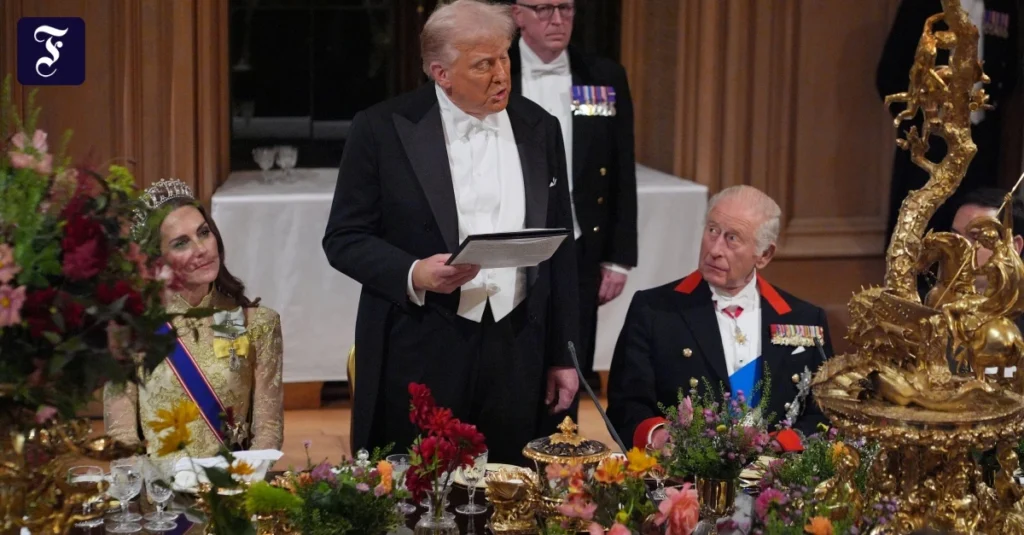 Anschließend wurden der US-Präsident und die First Lady von König Charles III. und Königin Camilla empfangen. Es folgte ein langer Händedruck zwischen Trump und Charles. Melania trug einen Hut, der ähnlich wie bei der Amtseinführung Trumps, einen Teil ihres Gesichts, auch ihre Augen, verdeckte.