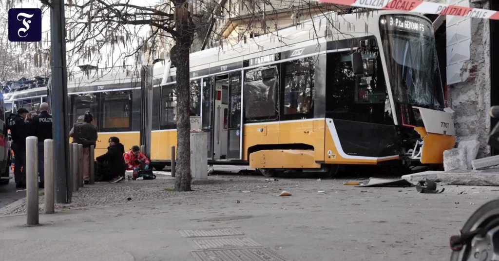 In Mailand entgleist am Freitagnachmittag die vollbesetzte Straßenbahn der Linie 9 prallt gegen ein Gebäude.