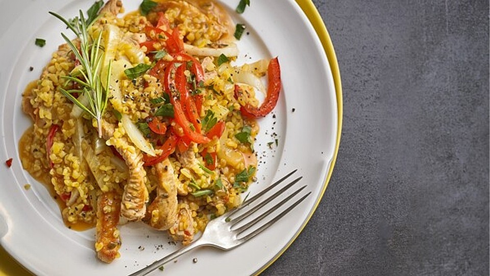 Brühe erhitzen und den Bulgur einrühren, 10 – 15 Minuten köcheln lassen. Fleisch und das angebratene Gemüse dazugeben, die Kochplatte sehr niedrig einstellen (bei Induktion reicht Stufe 2) und mit Ras el Hanout, Salz und Pfeffer pikant abschmecken. Das Gericht kann dann auf dieser Stufe einige Zeit nachziehen, ohne dass das Fleisch zu trocken wird.