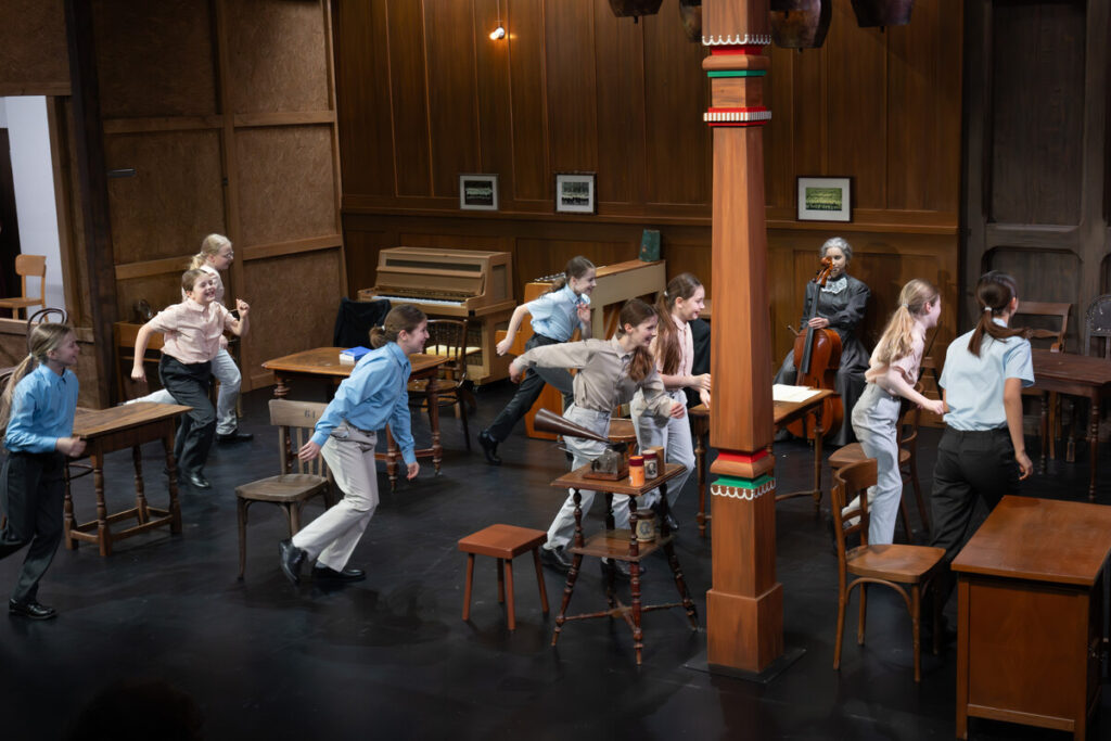 Dazu gehört auch in der kleinen „Opera stabile“ ein Wartesaal-Bühnenbild, das ebenso der Aufenthaltsraum eines Seniorenheimes oder einer angeranzten Kurklinik sein könnte, innenarchitektonisch ausgewiesen durch rustikale Holzverkleidung, abgenutztes Mobiliar und alte Tasteninstrumente. Eine Warnlampe blinkt stets hektisch los, wenn der Schallpegel die Zimmerlautstärke überschreitet.
