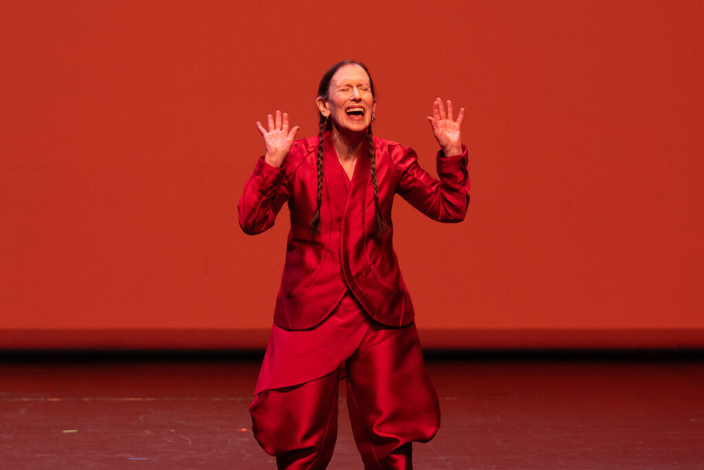 Jede Bewegung der 83-jährigen Frau mit ihren charakteristischen, bis zu den Hüften reichenden Flechtzöpfen in ihrem knallroten Seidenkostüm ist bewusst. Welch konzentrierte, minimale Moves sie sich selbst und ihren beiden Mitperformerinnen Katie Geissinger und Allison Sniffin in den Auftritt hineinchoreografiert hat – einmal die Handfläche zum Publikum drehen, einmal das Gesicht zueinanderwenden, dann wieder abwenden. Meredith Monk ist da ganz New Yorker Kunstszene, befreundet mit Minimal-Music-Größe Philipp Glass, wie man spätestens seit dem kürzlich erschienenem Doku-Film „Monk in Pieces“ weiß. Trotzdem ist ihre abstrakte Kunst eine ganz eigene, theatrale.