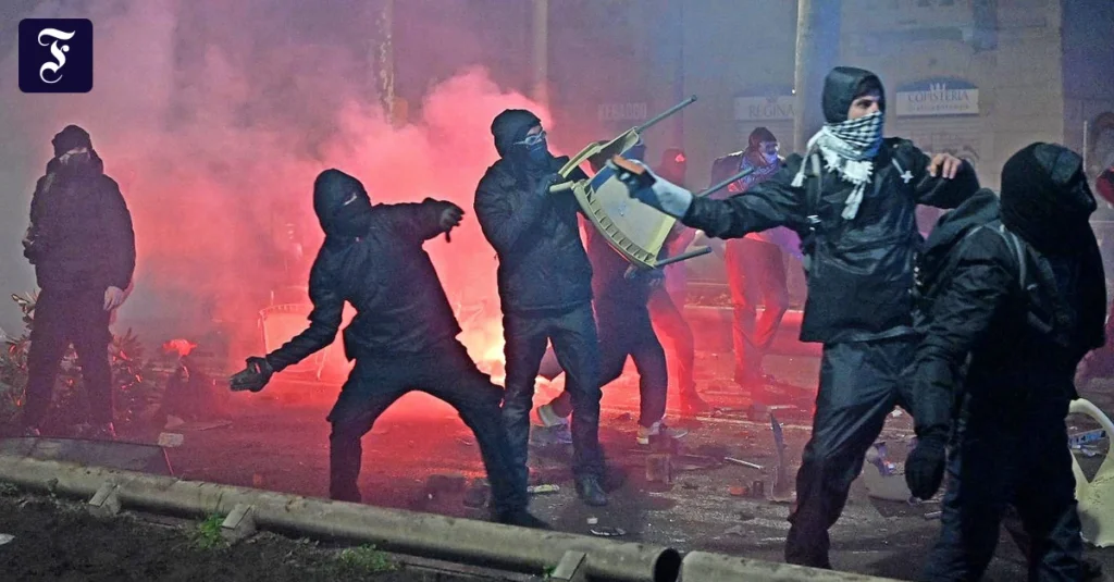 Am 30. Januar kam es dann bei einer Demonstration in Turin gegen die Räumung eines linken Kulturzentrums in einem besetzten Gebäude zu schweren Ausschreitungen, in deren Verlauf hundert Polizisten verletzt wurden. Auf einem Video war zu sehen, wie ein Beamter von einer Gruppe Randalierer von seiner Einheit isoliert, auf den Boden geworfen, mit Fußtritten traktiert und von einem Vermummten mit einem Spitzhammer auf den linken Oberschenkel geschlagen wurde. Ministerpräsidentin Meloni besuchte den verletzten Beamten im Krankenhaus und forderte, der Hammerangriff müsse von den Strafverfolgern als Tötungsversuch geahndet werden.